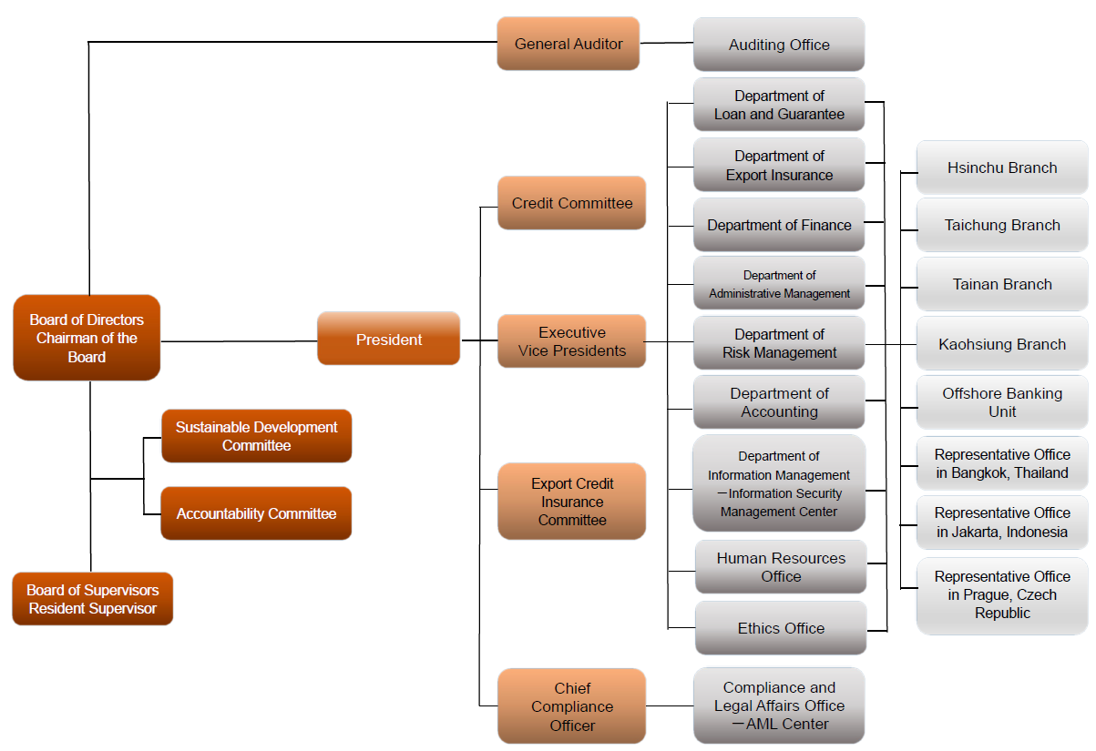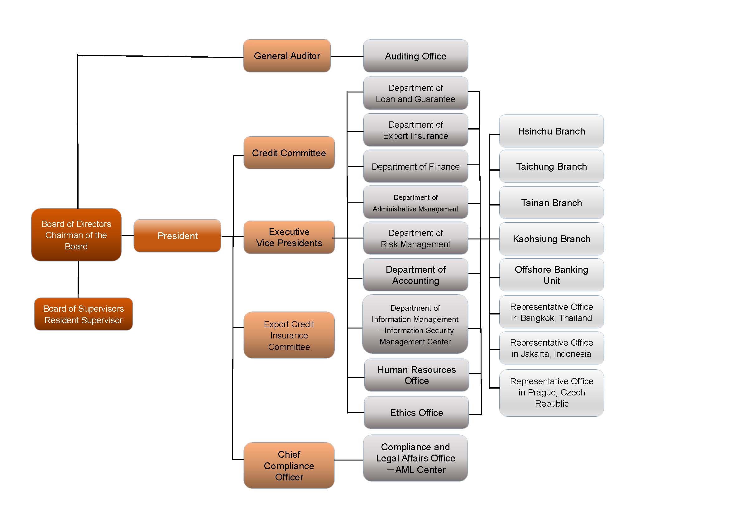 The Export-Import Bank of the Republic of China includes Auditing Office、Department of Loan and Guarantee、Department of Export Insurance、Department of Finance、Department of Risk Management、Department of Administrative Management、Department of Accounting、Department of Information Management (Information Security Management Center)、Human Resources Office、Ethics Office、Compliance and Legal Affairs Office (Anti-Money Laundering Center)、Credit Committee and Export Insurance Committee.