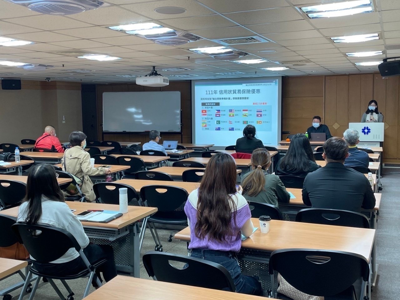 台中分行莊淑鴦專員介紹本行各項業務台南分行於111年3月28日與經濟部國際貿易局及外貿協會台南辦事處等單位合辦「國際行銷開發海外銷售通路實戰研討會」