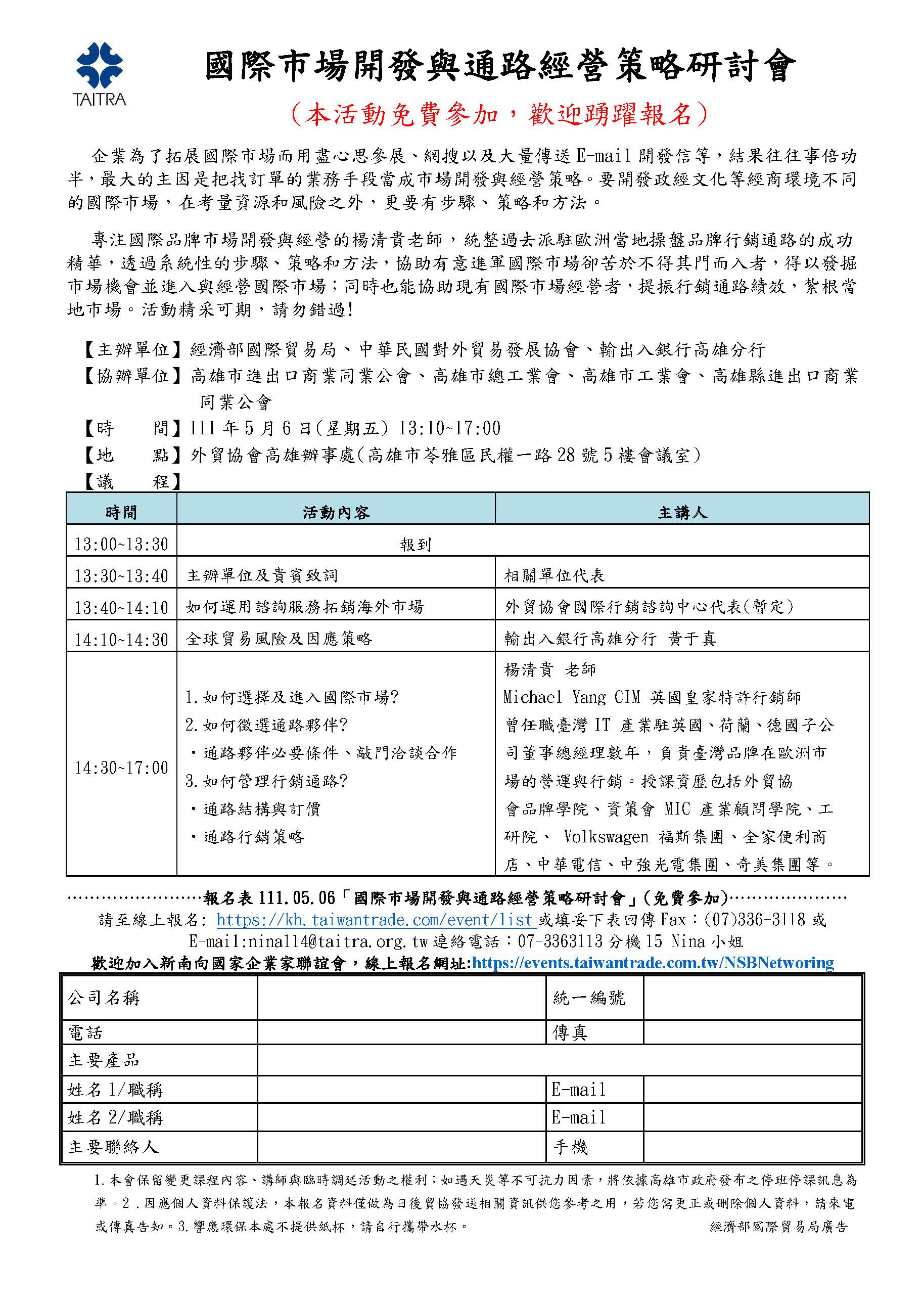 財團法人愛盲基金會-健康穀物禮盒、社團法人宜蘭縣自閉症協會-星創藝杯墊高雄分行與經濟部國貿局、貿協高雄辦事處於111年05月06日共同主辧「國際市場開發與通路經營策略」研討會企業為了拓展國際市場而用盡心思參展、網搜以及大量傳送E-mail開發信等,結果往往事倍功半,要開發經商環境不同的國際市場,在考量資源和風險之外,更要有步驟、策略和方法。本次硏討會透過系統性的步驟、策略和方法,協助有意進軍國際市場卻苦於不得其門而入者,得以發掘市場機會並進入與經營國際市場。另輸出入銀行將針對「全球貿易風險及因應策略」詳加介紹,提供您拓展海外市場的堅實支援,歡迎踴躍參加。