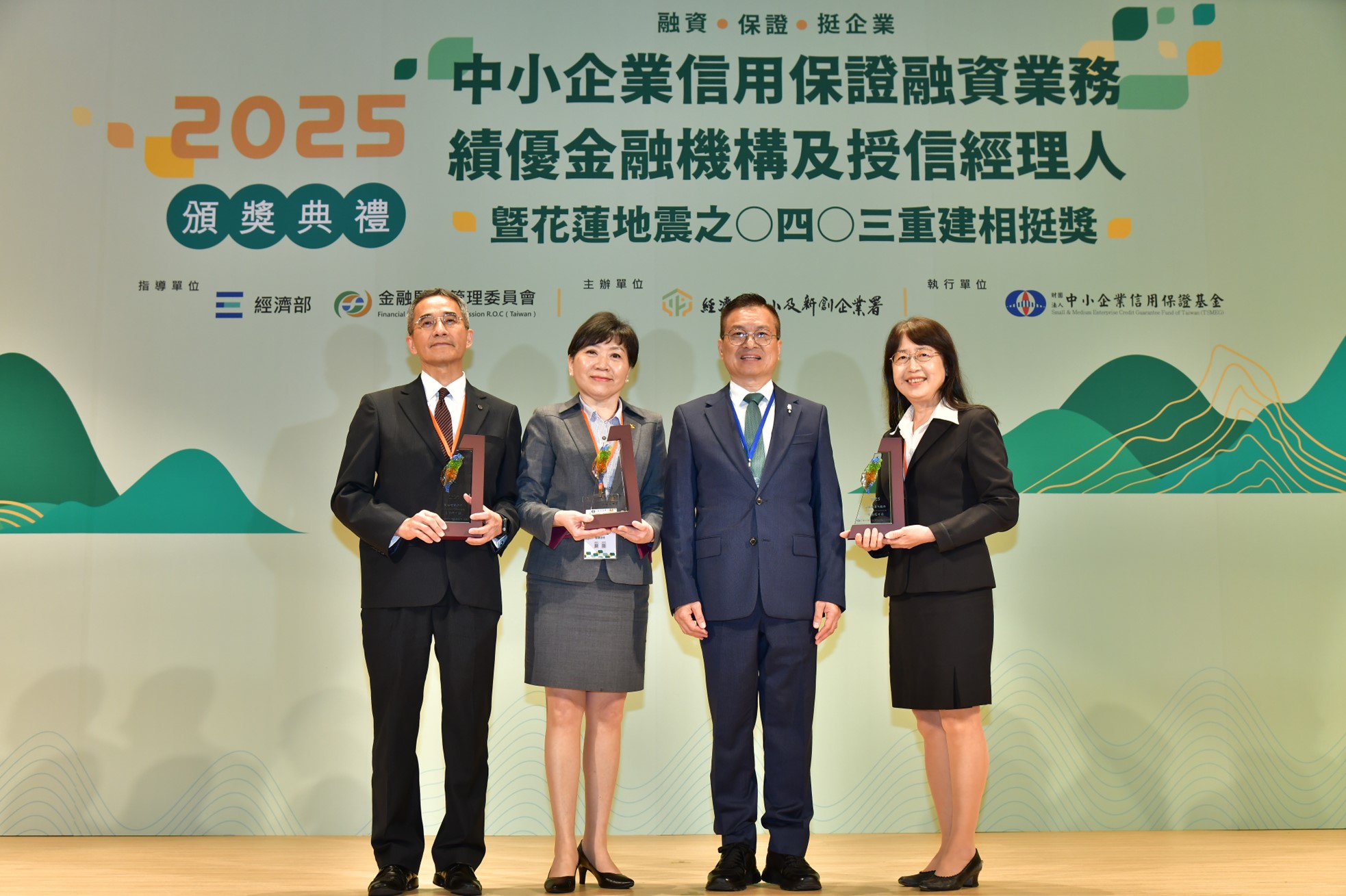 中小企業信用保證基金於114年3月27日舉行「2025中小企業信用保證融資業務績優金融機構及授信經理人暨花蓮地震之○四○三重建相挺獎頒獎典禮」。輸出入銀行首次榮獲「信保躍升獎」,由副總經理顏春蘭代表領獎。
